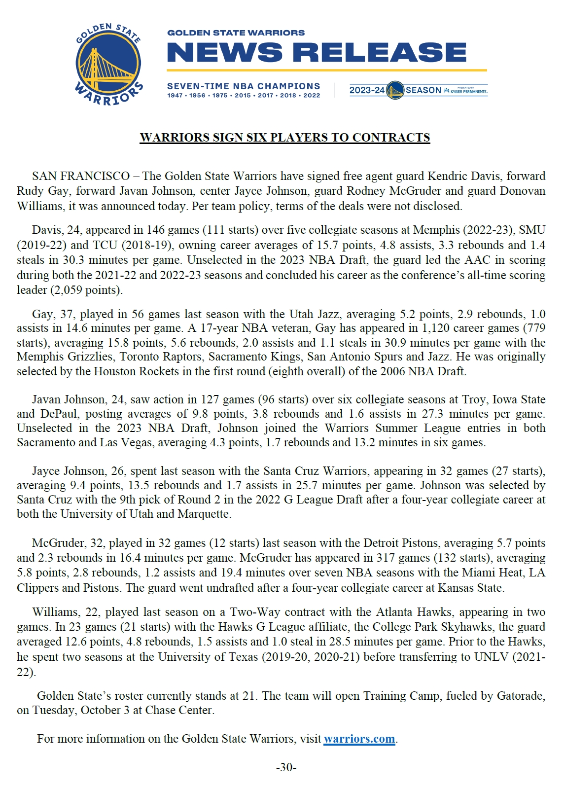 直播吧09月29日讯 今天,金州勇士一次性官宣签约6名球员,老将鲁迪-盖伊和麦格鲁德在列。根据球队政策,合同情况未予公布。