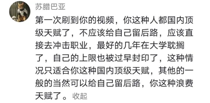 第一次刷到你的视频,你这种人都国内顶级天赋了,不应该给自己留后路,应该直接冲击职业,最好的几年在大学耽搁了,自己的上限也被过早封印了,这种情况只适合你这种国内顶级天赋,其他的一般的当然可以给自己留后路,你这种浪费天赋了。
