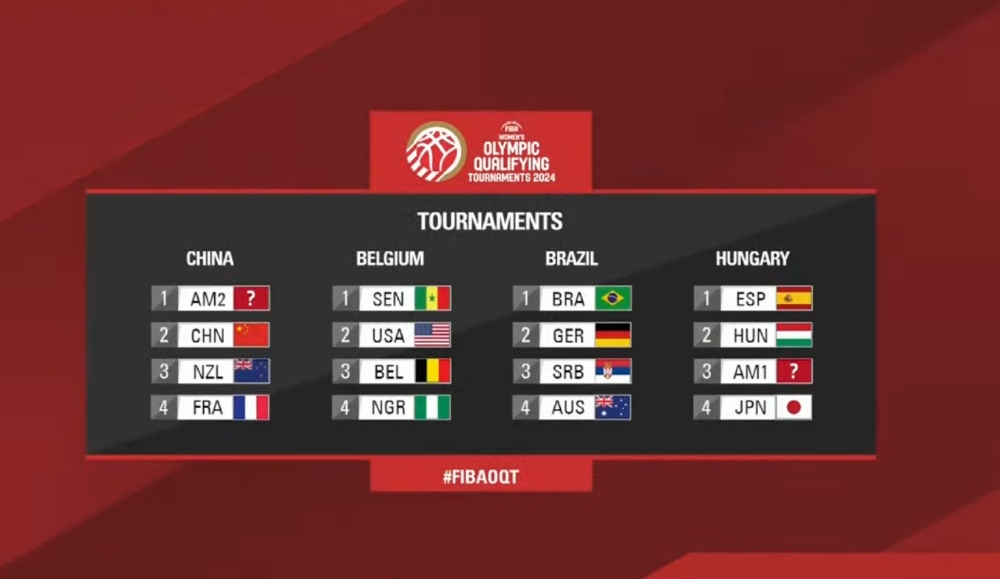 目前欧洲区、亚大区、非洲区都已确定参赛队,美洲区还差两个名额,将在加拿大、波多黎各、哥伦比亚、委内瑞拉这四个队中产生两个,这两个名额将在2023年11月进行的奥运女篮资格赛预选赛中产生。