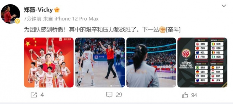 今日,中国女篮主帅郑薇更博庆祝胜利:“为团队感到骄傲!其中的艰辛和压力都战胜了。下一站加油!”