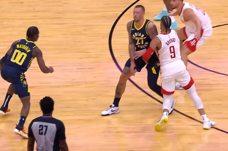 首节比赛,火箭新援狄龙-布鲁克斯在试图绕过泰斯掩护时,左手击中对方裆部。裁判在查看回放之后,直接吹狄龙二级恶意犯规,将其驱逐出场。