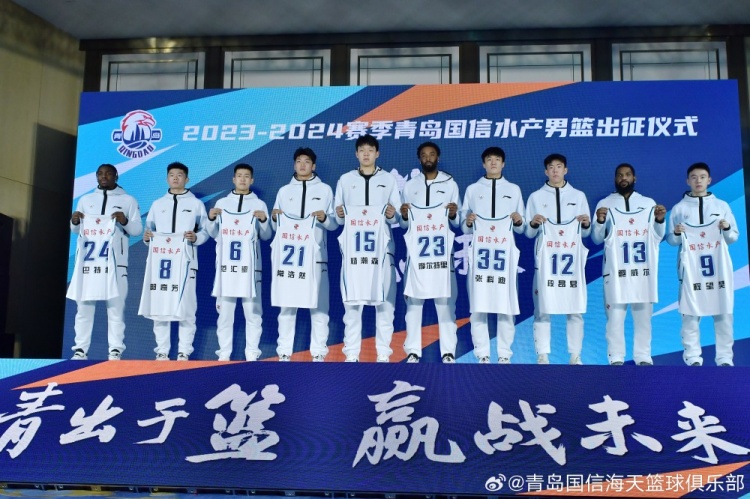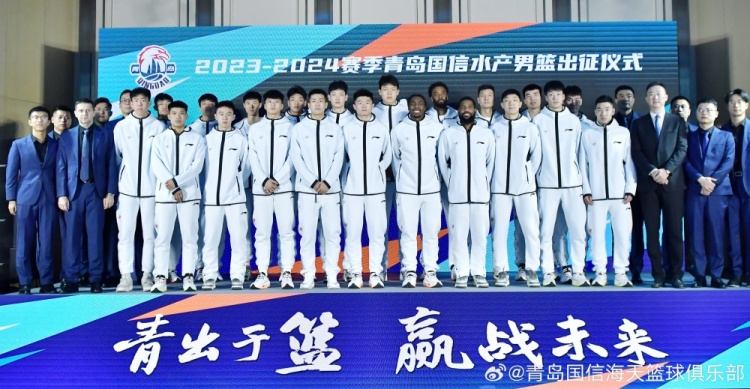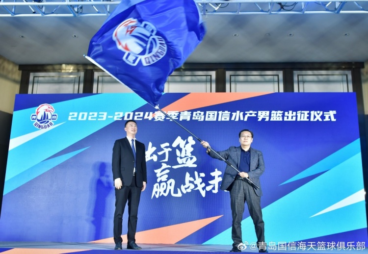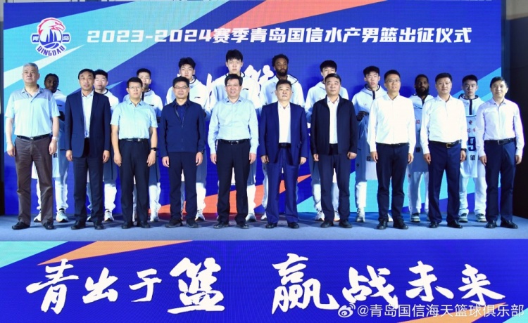 在出征仪式上,青岛国信水产男篮球队阵容全新亮相,到场领导嘉宾为新入队球员颁发新赛季战袍。主教练刘维伟从国信集团党委书记、董事长刘鲁强手上接过球队队旗,青岛国信水产男篮正式拉开新赛季战幕。