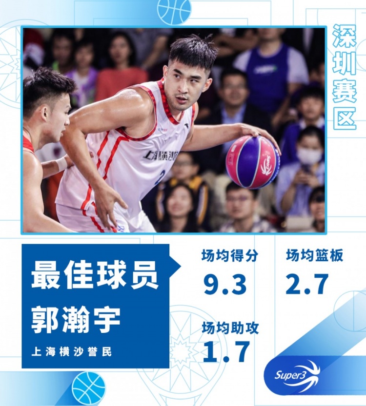 继斩获超三联赛重庆黔江赛区最佳球员之后,来自上海横沙誉民的郭瀚宇再度拿下深圳赛区最佳球员奖项。深圳赛区期间,郭瀚宇共出战3场比赛,场均可贡献9.3分2.7篮板1.7助攻。上海横沙誉民在本站取得4胜0负战绩,目前位居积分榜第三位。