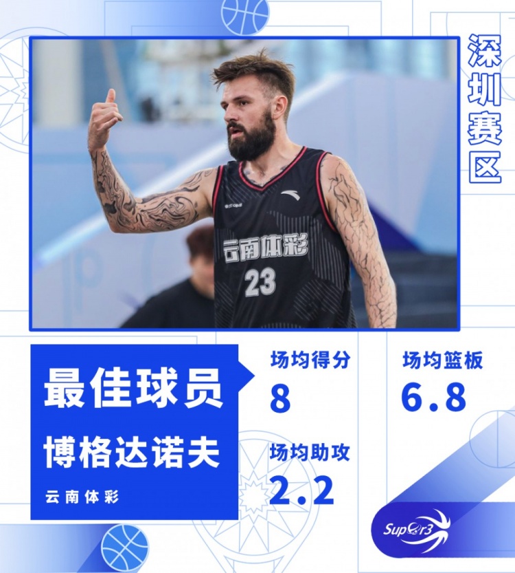 来自云南体彩的博格达诺夫获得超三卫星赛(深圳赛区)最佳球员。在深圳赛区期间,博格达诺夫共出战5场比赛,场均贡献8分6.8篮板2.2助攻,帮助球队在该赛区取得全胜的战绩,目前云南体彩在积分榜上排名第二,成功晋级附加赛。