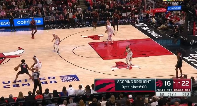 第一节后半节,猛龙突然断电,长达6分钟的时间里一分未得,公牛趁势轰出20-0的进攻狂潮反超比分。