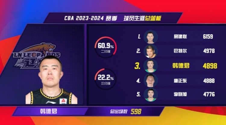 韩德君篮板总数成为CBA联赛历史篮板总数第三位(4898个),一共历经598场比赛。在CBA联赛篮板榜单上,排在前两位的是易建联(6159个,625场)和巴特尔(4978个,487场)。