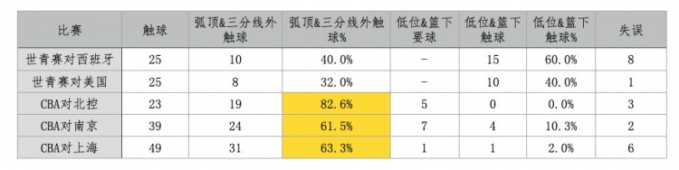 尤其是首轮对阵北控的比赛,杨瀚森在弧顶和三分线外拿到球的比例占82.6%,并且完全没有在篮下或低位区域拿到球(挡拆顺下不计入)。