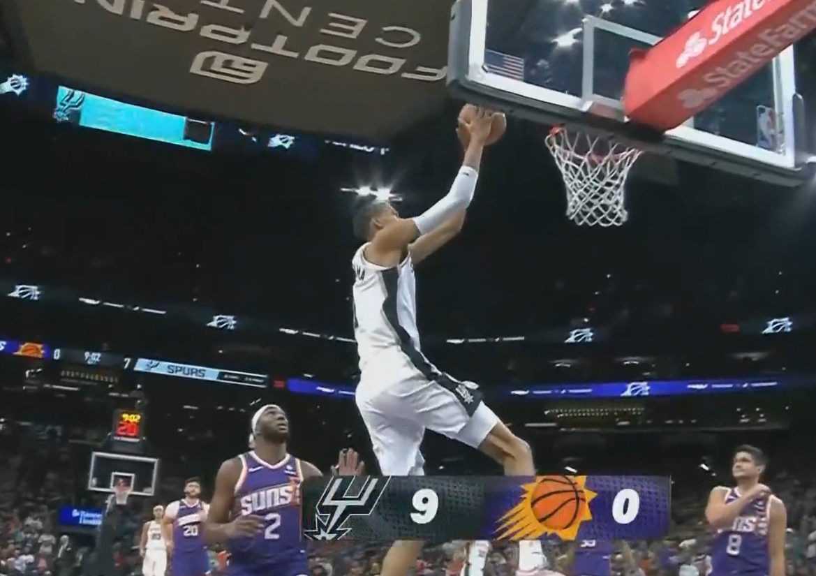 文班快下接到传球轻松挂筐灌篮 马刺开场9-0打停太阳