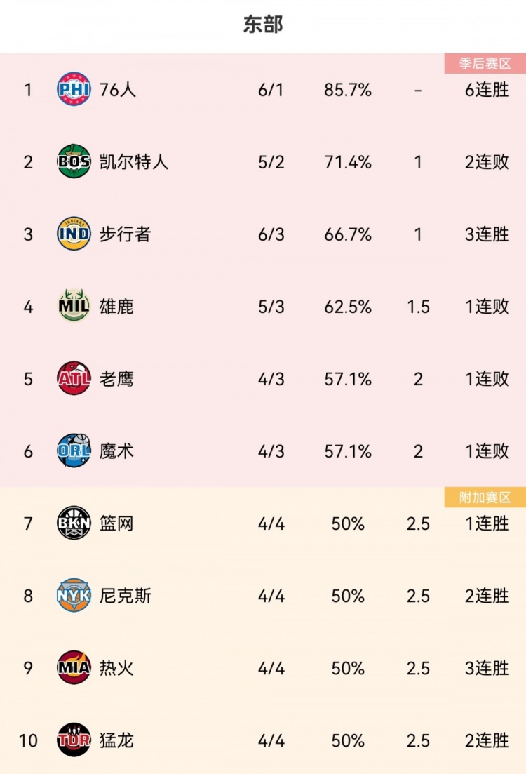 至此,步行者战绩来到了6胜3负,排名升至东部第三。