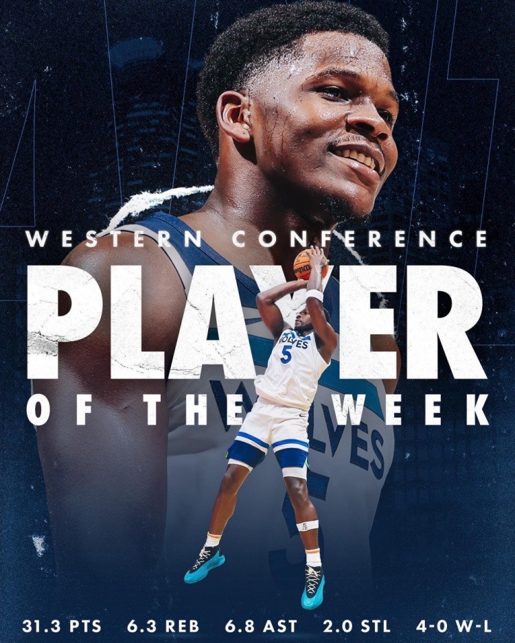 森林狼官方为爱德华兹发布周最佳海报,并配文:“生涯第一个周最佳🐜!”