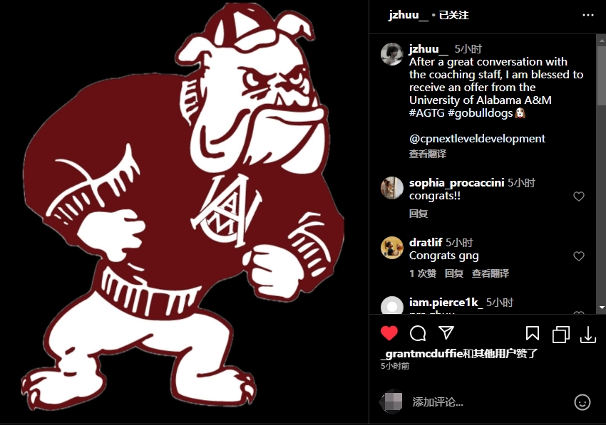 直播吧11月14日讯 今日,2026届16岁华裔控卫朱正(Jacob Zhu)在个人Ins宣布自己接受了阿拉巴马农工大学的Offer,正式加入阿拉巴马农工大学斗牛犬篮球队。阿拉巴马农工大学斗牛犬篮球队隶属于NCAA一级联盟。