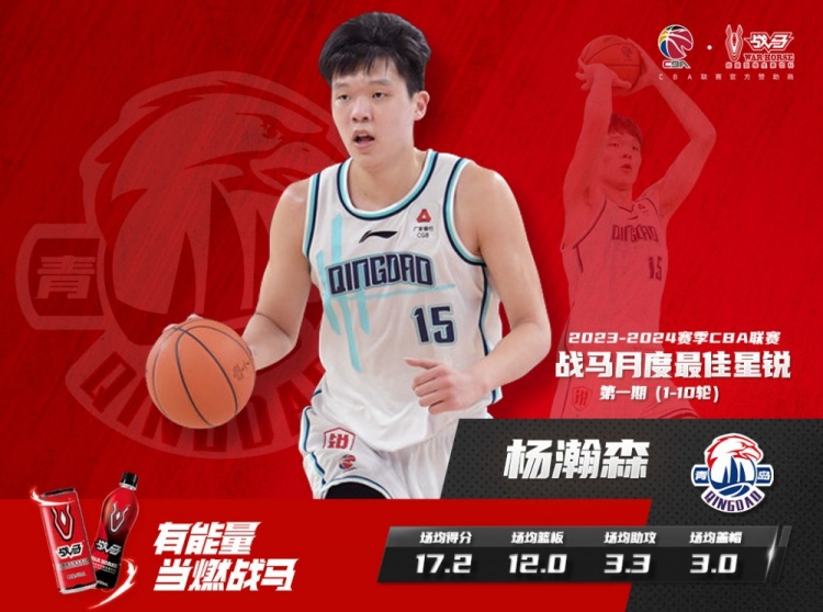 【CBA联赛“战马月度最佳星锐球员”——杨瀚森】恭喜青岛男篮球员杨瀚森荣膺2023-2024赛季CBA联赛第一期“战马月度最佳星锐球员”!