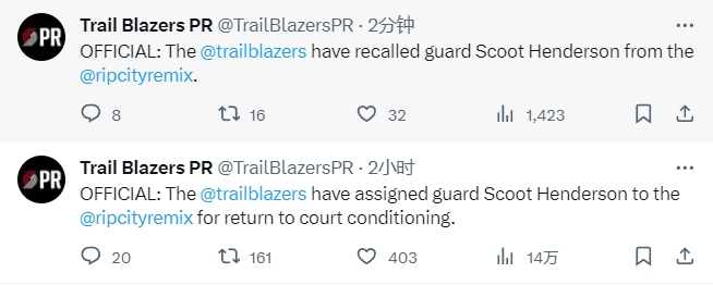 >什么情况🤔?开拓者官方将亨德森下放至发展联盟 两小时就召回