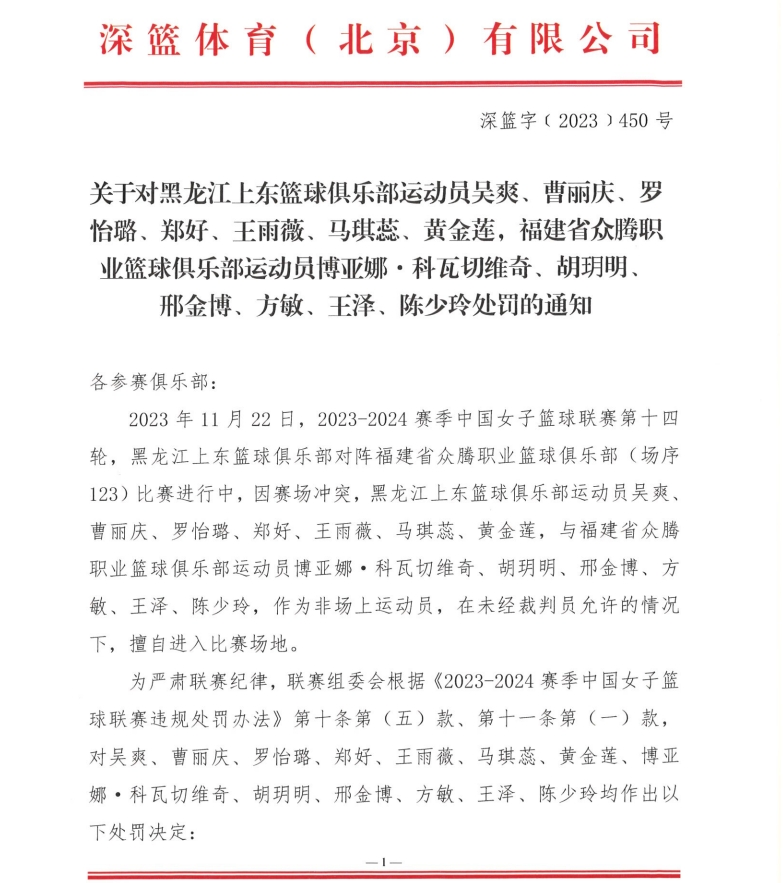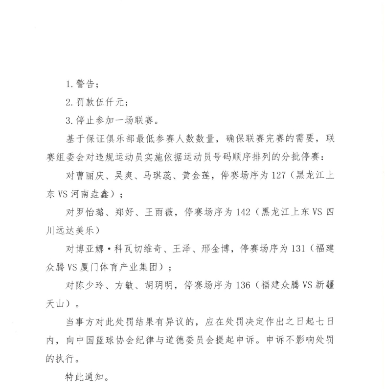 有6名球员被罚款1万+停赛2场+取消评奖资格(周月明、张亚琪、钱内迪·卡特、陆紫薇、刘纯韶、陈思奇);
