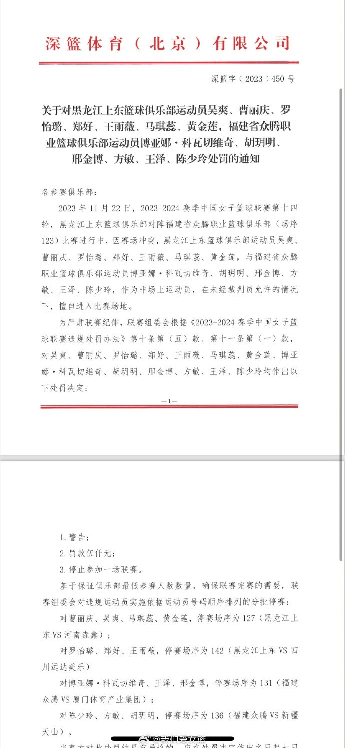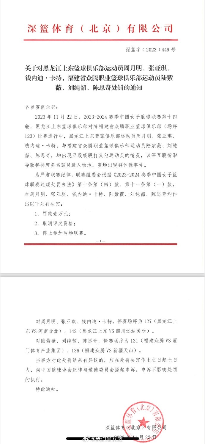 有6名球员被罚款1万+停赛2场+取消评奖资格(周月明、张亚琪、钱内迪·卡特、陆紫薇、刘纯韶、陈思奇);