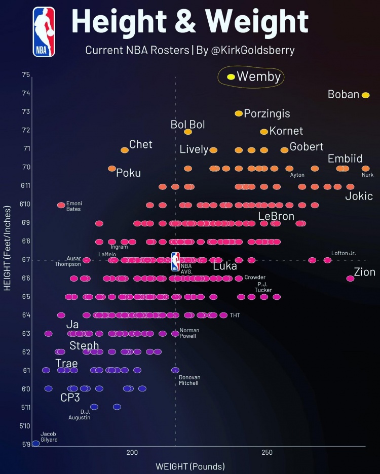 >NBA球员身高体重对比图:文班亚马博班独一档 锡安又矮又壮👀