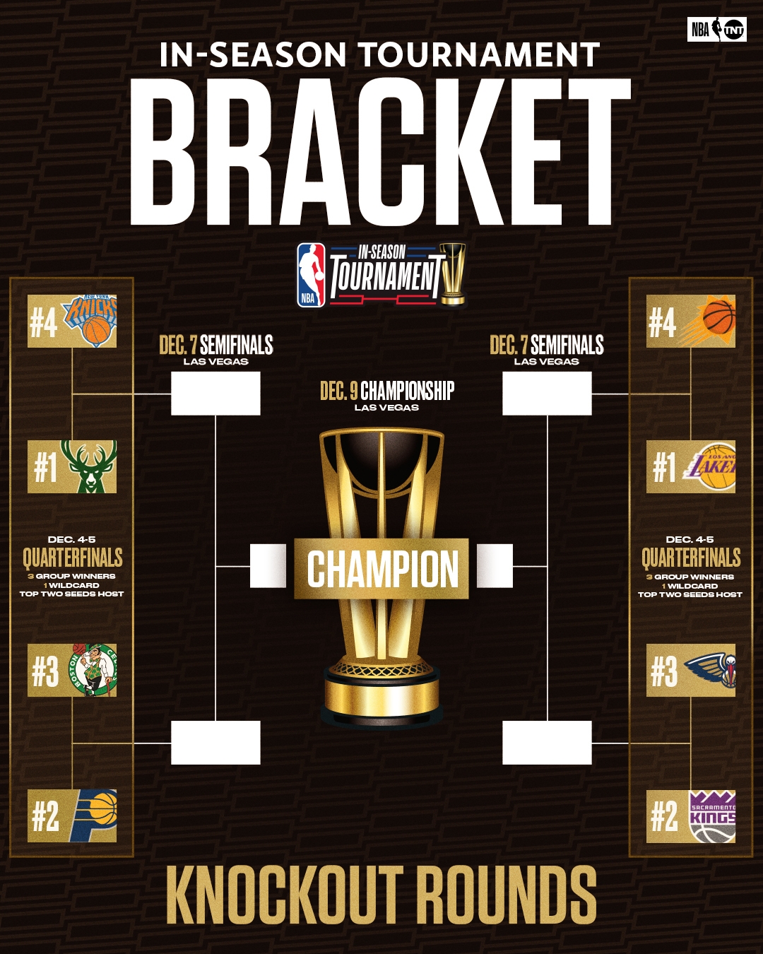 直播吧11月29日讯 NBA季中锦标赛小组赛全部结束,晋级淘汰赛的8支球队对阵出炉。