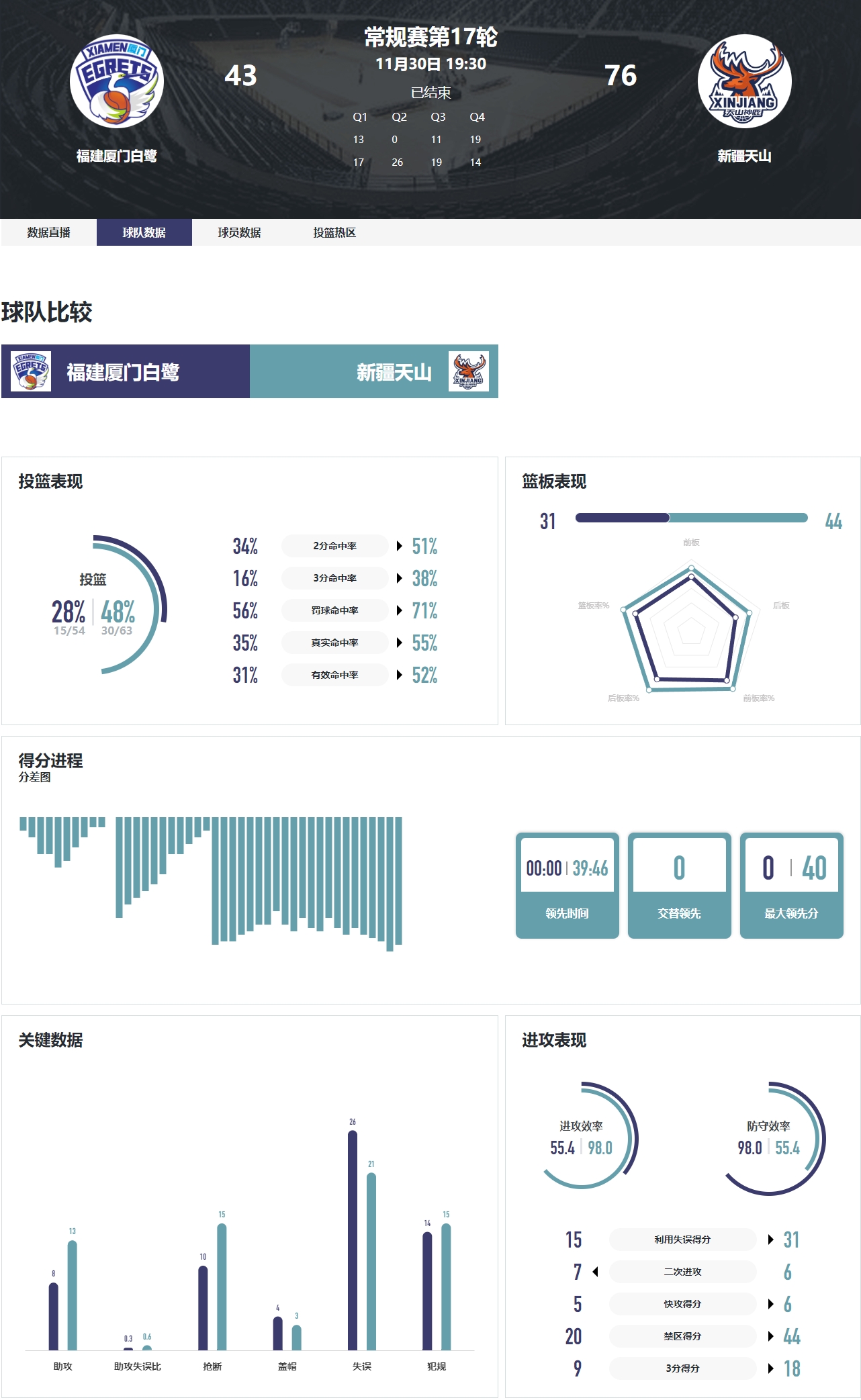 首节比赛一上来,新疆女篮依靠内突外投连续取分,一度打出15-0的攻击波,直到第一节还剩3分35秒时,厦门女篮才依靠陈艺婷的三分打破僵局。不过厦门女篮在第一节将比分追至13-17后,并未延续追分势头,整个第二节比赛也遭到零封。