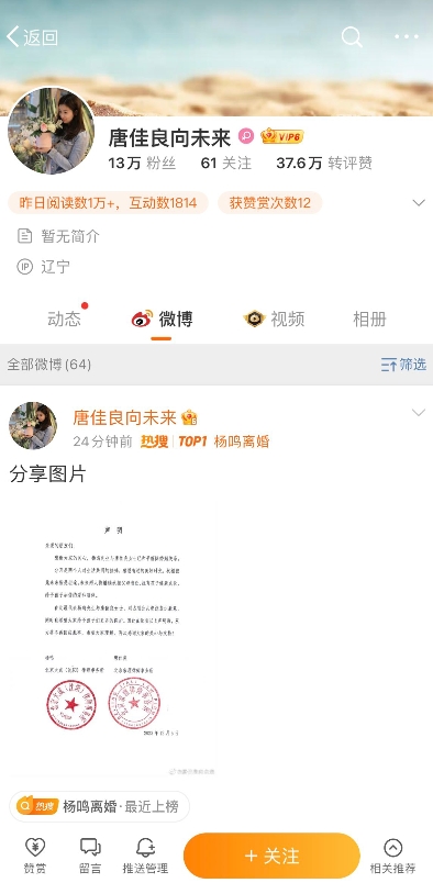 杨鸣前妻唐佳良将自己的微博昵称从杨鸣背号改为向未来