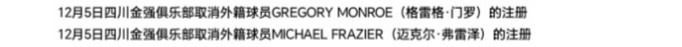 四川取消了格雷格-门罗和迈克尔-弗雷泽的注册。目前四川的外援为肯尼-伯顿和罗伯特-高登。