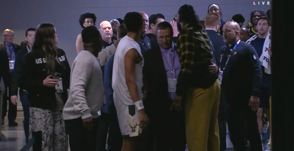 >😂步行者队把球给拿走了!字母哥不顾工作人员拉拽直冲球员通道