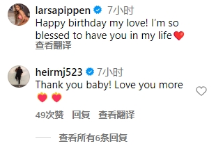 直播吧12月25日讯 美国当地时间24日是乔丹二儿子马库斯的33岁生日,他的女友——49岁的皮蓬前妻拉尔萨今日晒出二人合照,并发文祝马库斯生日快乐:“生日快乐,我的挚爱!生命中有你实在太幸运了❤️。”马库斯则回复:“蟹蟹宝宝!更爱你了❤️🔥❤️🔥。”