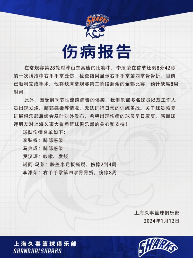 上海队官博写道:“目前球队多名球员遭受伤病侵袭,关于恢复进展俱乐部后续会及时对外发布,希望出现伤病的球员早日康复,感谢球迷朋友对上海久事大鲨鱼篮球俱乐部的关心和支持。”