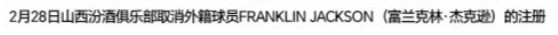 直播吧2月28日讯 今天CBA官方更新了外籍球员注册信息,山西取消富兰克林-杰克逊的注册。