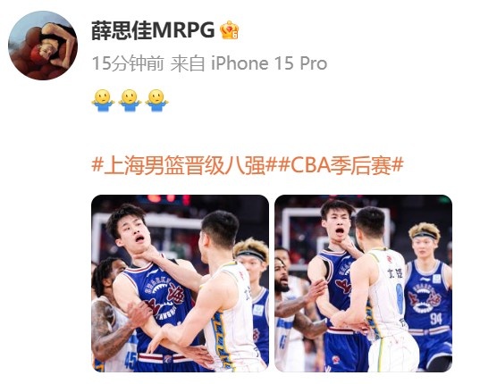 赛后,《东方体育日报》记者薛思佳晒出戴昊被方硕掐脖子的照片,并配上三个摊手的表情。