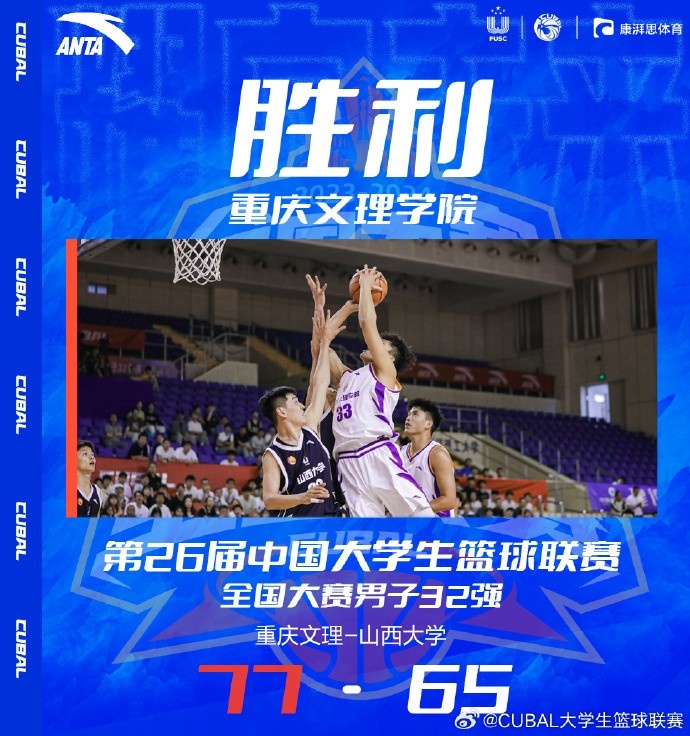 末节争夺,两队围绕10分分差展开拉锯战,重庆文理稳定输出,山西大学连投带罚努力追赶,篮板优势帮助重庆文理占据场上主动,但山西大学顽强迫近比分,关键时刻李书缘连续拿分帮助重庆文理打出7-1的小高潮将分差再度拉开到两位数锁定胜局。最终,重庆文理77-65力克山西大学。