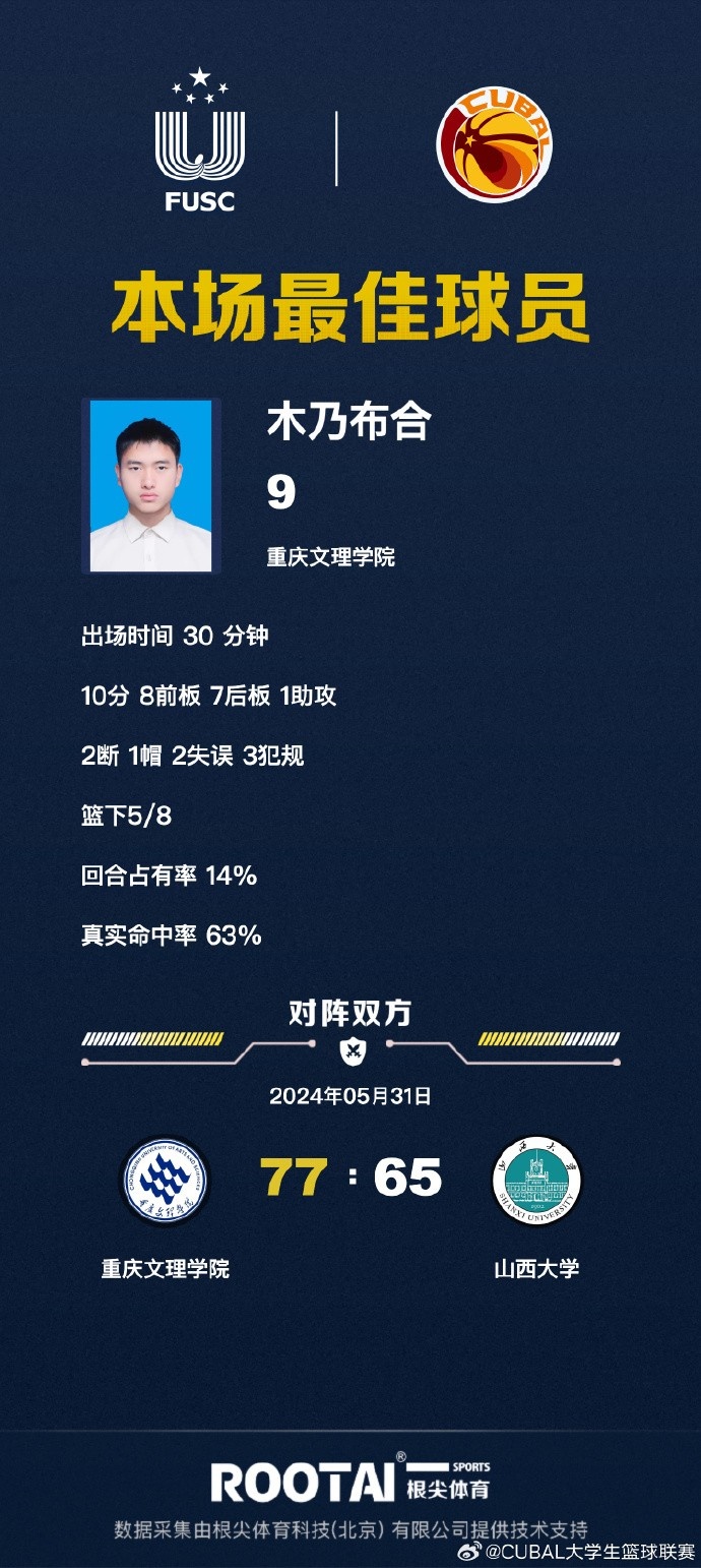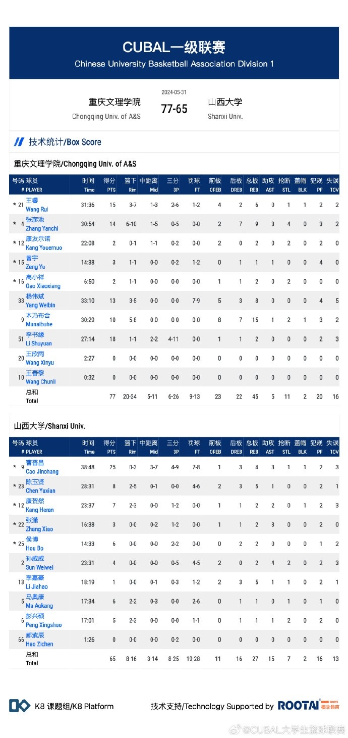 重庆文理:李书缘18分,王睿15分6板,张彦池14分9板,杨伟斌13分8板,木乃布合10分15板
