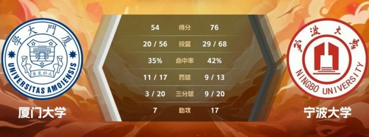 末节比赛,厦门大学的进攻表现更加糟糕,半节的时间只拿到2分,宁波大学没有再给机会直接将分差扩大到二十分,比赛也就此失去悬念,最终宁波大学76-54轻取厦门大学迎来四连胜。
