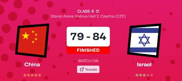 开场后拉维夫带领以色列取得领先,中国整体手感不佳,梁雅琦内线表现强势为中国咬住比分。第二节拉维夫凭借个人能力帮助以色列将分差拉大到两位数,中国及时调整掀起反扑一度追平比分,不过以色列又打出一波攻势在半场结束前再度取得领先。易边再战,两队依旧是拉锯战,拉维夫多次帮以色列扩大优势,随后中国又将比分追上,但中国始终未能完成反超。第四节冉珂嘉和梁雅琦联手带队掀起一波反扑完成反超,此后两队陷入僵持,中国一次失误被以色列取得3分优势,此后努力追分但防守端都未能限制对手,李雨汧最后尝试三分未果,最终中国79-84惜败以色列。