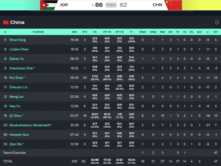 约旦男篮这边,老将阿巴斯14中6,三分3中3,罚球6中5,得到20分10篮板。归化球员达尔-塔克21中9,三分9中4,罚球12中10,得到32分11篮板5助攻。穆哈迈德-侯赛因13中5,罚球2中1,得到11分14篮板。