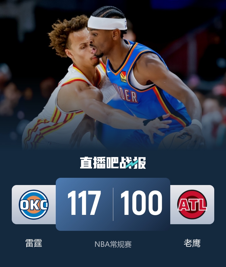 比赛开始,双方上来都迅速进入状态,霍姆格伦外线手感火热连续命中,雷霆三分多点开花,老鹰连续攻击内线追到差5分,次节双方继续拉锯战,亚历山大外线不开但两分一球不丢,吹杨里突外投一度追到差1分,但亚历山大再次站出来领先5分。下半场,雷霆上篮8-0拉开双位数领先,老鹰苦苦追分,但亚历山大外线也开,根本挡不住带队直接领先20分以上,末节雷霆继续发力牢牢掌握住20分以上领先,亚历山大直接打卡下班,最终雷霆117-100轻取老鹰。