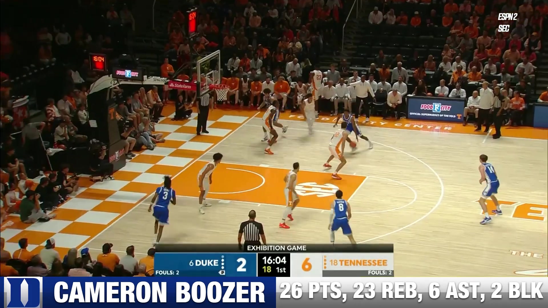 此役,明年状元候选、杜克大学前锋卡梅隆-布泽尔表现优异,打出了双20的数据,还在比赛中送出了一记炸裂的抓帽。
