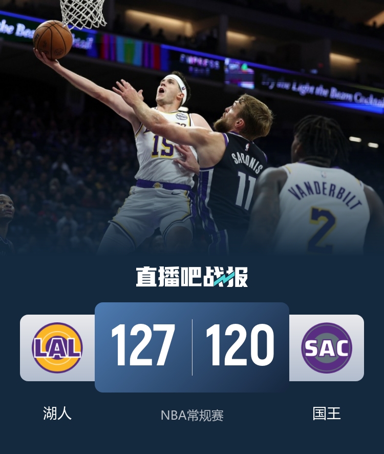 比赛开始,八村塁和艾顿连续内线取分打得很主动,拉文里突外投回应,随后湖人全员充满活力首节领先9分,次节湖人断电,威少有攻有传带领国王轰出13-2反超比分,里夫斯三分加罚球止血,威少连续2记三分回应,双方多次打平展开拉锯战。下半场,拉文攻筐后蒙克连续三分,里夫斯造杀伤同时串联球队回应,双方比分继续胶着,里夫斯再连得5分助湖人三节领先5分,末节国王上来8-0反超比分,但里夫斯继续炸裂状态连续3记三分强势回应,湖人重新掌握主动权,国王10-3打回悬念,艾顿关键前场篮板,里夫斯4罚全中锁胜局,最终湖人127-120力克国王,拿到连胜。