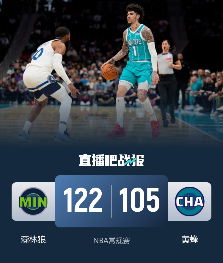比赛开始,布里奇斯手感火热,外线飙中4记三分单节独得18分,帮助黄蜂打出12-2的攻击波取得领先,兰德尔内外开花带队追赶,次节森林狼抢占先机,里德连得8分引领球队10-0的攻击波,黄蜂及时回暖,鲍尔连得5分,布里奇斯三分还有,半场战罢黄蜂56-50领先森林狼。易边再战,黄蜂命中率下降,森林狼多点开花打出13-2的攻击波确立两位数优势,末节森林狼一度将分差拉开到17分,黄蜂奋力反击回敬10-2的攻击波,森林狼3记三分稳住局势,黄蜂苦苦追赶无果。最终,森林狼122-105击败黄蜂,客场过关。