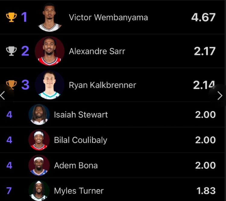 场均封盖榜上,第二名萨尔约为2.2次。而总封盖数上,文班6场比赛28次、第二名的卡尔克布伦纳7场15次。
