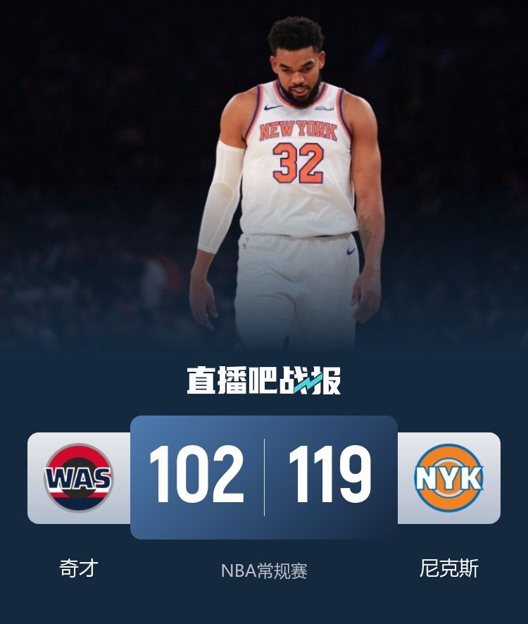 直播吧11月4日讯 NBA常规赛,尼克斯今日迎战奇才,前者上场比赛战胜公牛,后者则是遭遇四连败,此役米德尔顿和米切尔-罗宾逊缺战。