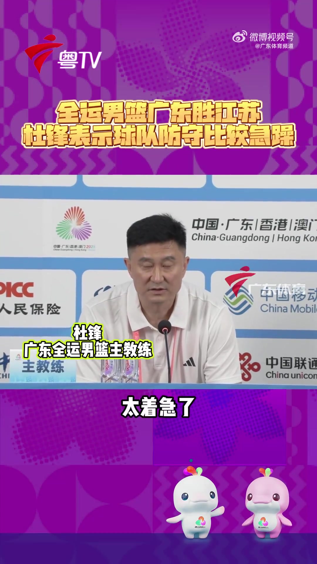 直播吧11月6日讯 全运男篮小组赛,广东全运男篮96-73战胜江苏全运男篮。赛后,广东队主教练杜锋出席了新闻发布会。