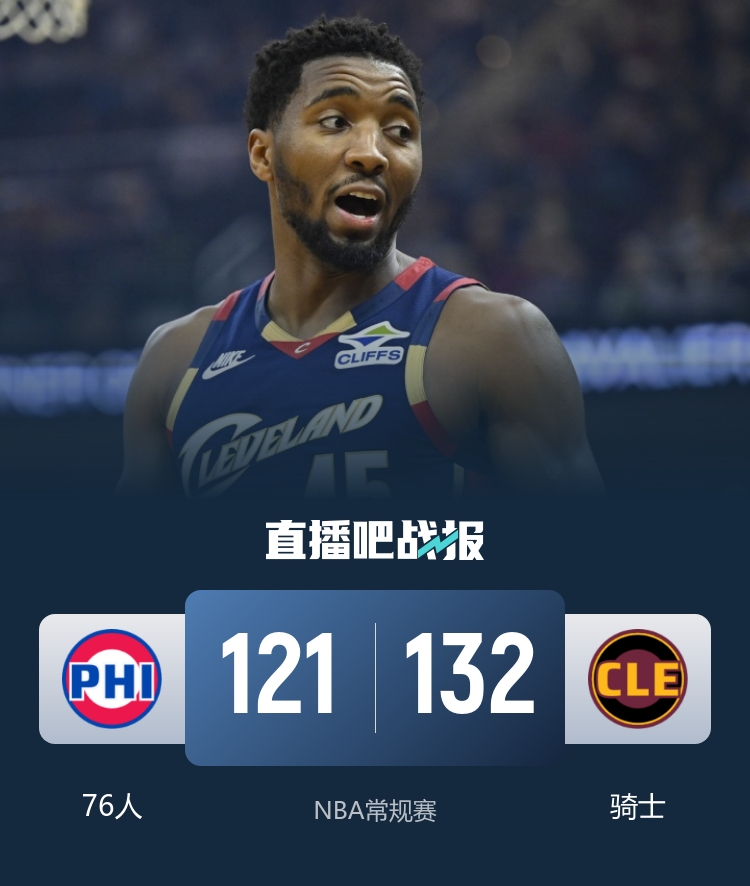 比赛开场,骑士队先声夺人,米切尔内外开花带领球队打出一波17-4,此后牢牢掌握两位数的领先优势,球队单节砍下41分。次节骑士稳扎稳打继续控制分差,但节末马克西突然爆发,连续砍分帮助76人队将分差迫近到3分,半场结束比分来到67-70。易边再战,76人很快将比分追平,但骑士紧接着又打出一波13-0将分差重新拉开,米切尔又是单节砍下15分,在第三节结束时帮助球队领先到20分。末节开战,双方开始交替取分,分差一直在20分上下波动,比赛结果盖棺论定,最终骑士主场132-121力克76人,取得两连胜。