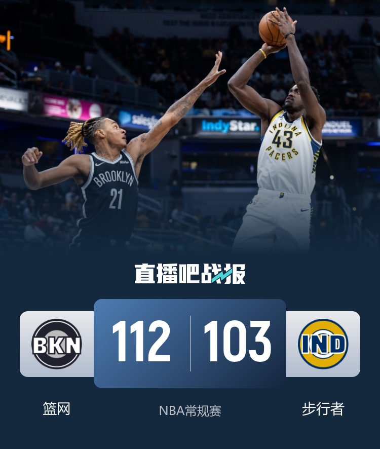 比赛开始,小波特外线连中3分砍下8分带队轰出15-6不错开局,步行者全民皆兵开始追分,托马斯伤退,首节篮网领先7分,次节步行者上来9-1直接反超比分,随后双方展开胶着拉锯战,步行者次节轰出41分一举反超5分。下半场,卡莱尔被驱逐,小波特带队7-2追平比分,但西亚卡姆进攻端也回暖,双方比分交替领先,三节篮网还落后3分,末节篮网上来12-3再次建立主动权,步行者进攻端断电打了8分多钟还未上双,篮网领先到双位数,最终篮网112-103力克步行者,拿到赛季首胜。
