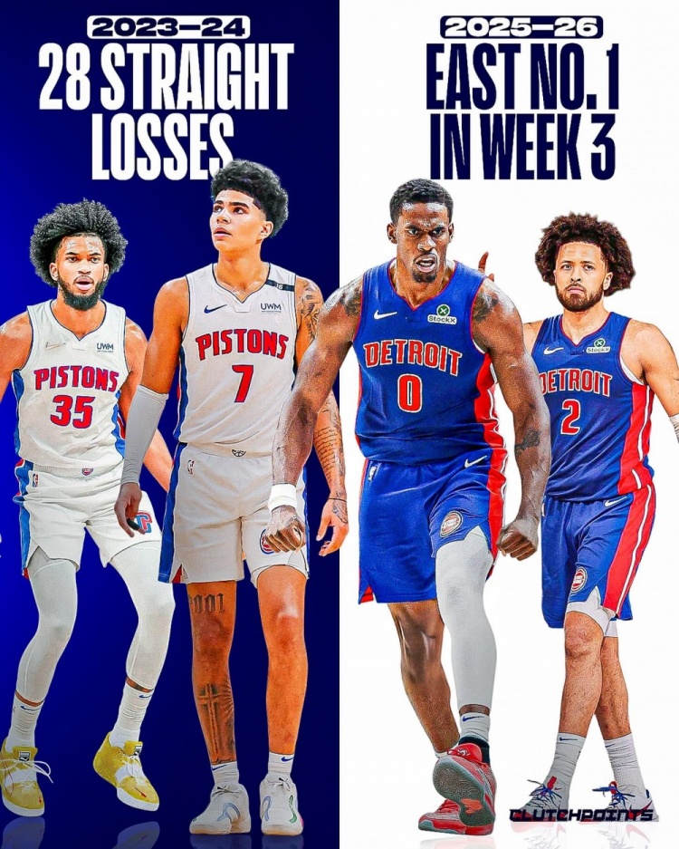 23-24赛季活塞曾遭遇平NBA历史单赛季纪录的28连败,而如今他们7胜2负高居东部第一。