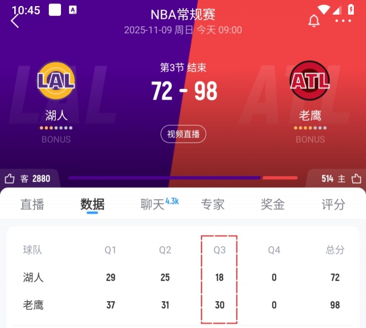>三崩名不虚传!湖人面对几乎全替补老鹰第三节单节仅得18分