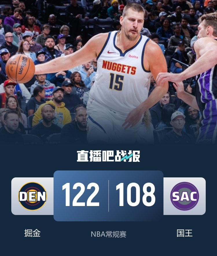 比赛开场,两队很快进入比赛状态,约基奇单节6投全中帮助掘金建立领先优势,但节末国王打出一波9-0将比分反超。次节两队手感有所冷却,得分多是零敲碎打,两队交替领先,半场结束掘金60-56国王。易边再战,掘金又是率先发力取得领先,但国王顽强紧咬比分,在三节结束时又将分差缩小到3分。末节回来,场上形势风云突变,掘金打出一波16-2将分差拉开到10分,并且在本节还剩3分钟时小萨遭遇6犯,国王没能再缩小分差,掘金122-108再胜国王。