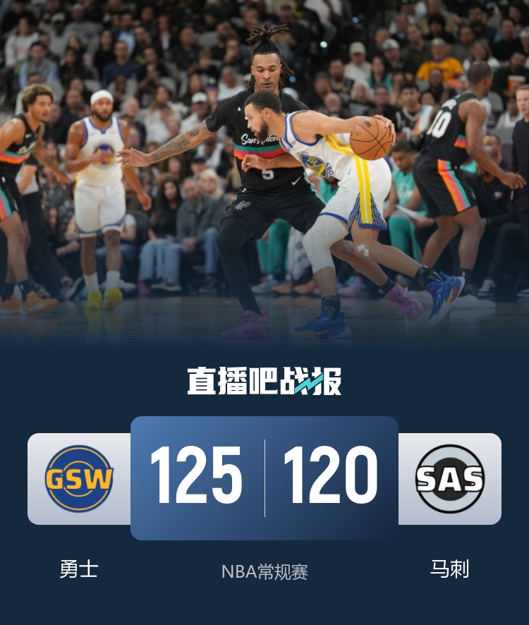 比赛开场,马刺队率先发力,连续在内线取分建立领先优势,而勇士在文班亚马的威慑下进攻端出现问题,单节三分球18中4,甚至在本节最后4分50秒内没有得分,首节结束以14-28落后。次节开战,卡斯尔继续带动球队,半场7投6中砍下14分7助攻,帮助马刺稳扎稳打维持分差,一度领先到16分,但在卡斯尔3犯下场后勇士很快打出一波9-0,在半场结束时49-56落后7分。易边再战,库里外线手感回暖单节砍下22分帮助勇士蚕食分差并取得反超,此后继续稳扎稳打,勇士单节狂砍43分在三节结束时领先到8分。末节回来,两队陷入拉锯战,文班在本节予取予求帮助马刺紧咬,分差在5分上下浮动,比赛最后两分钟巴特勒投中三分,马刺进攻连续不中,比赛结果盖棺论定,最终勇士125-120逆转战胜马刺。