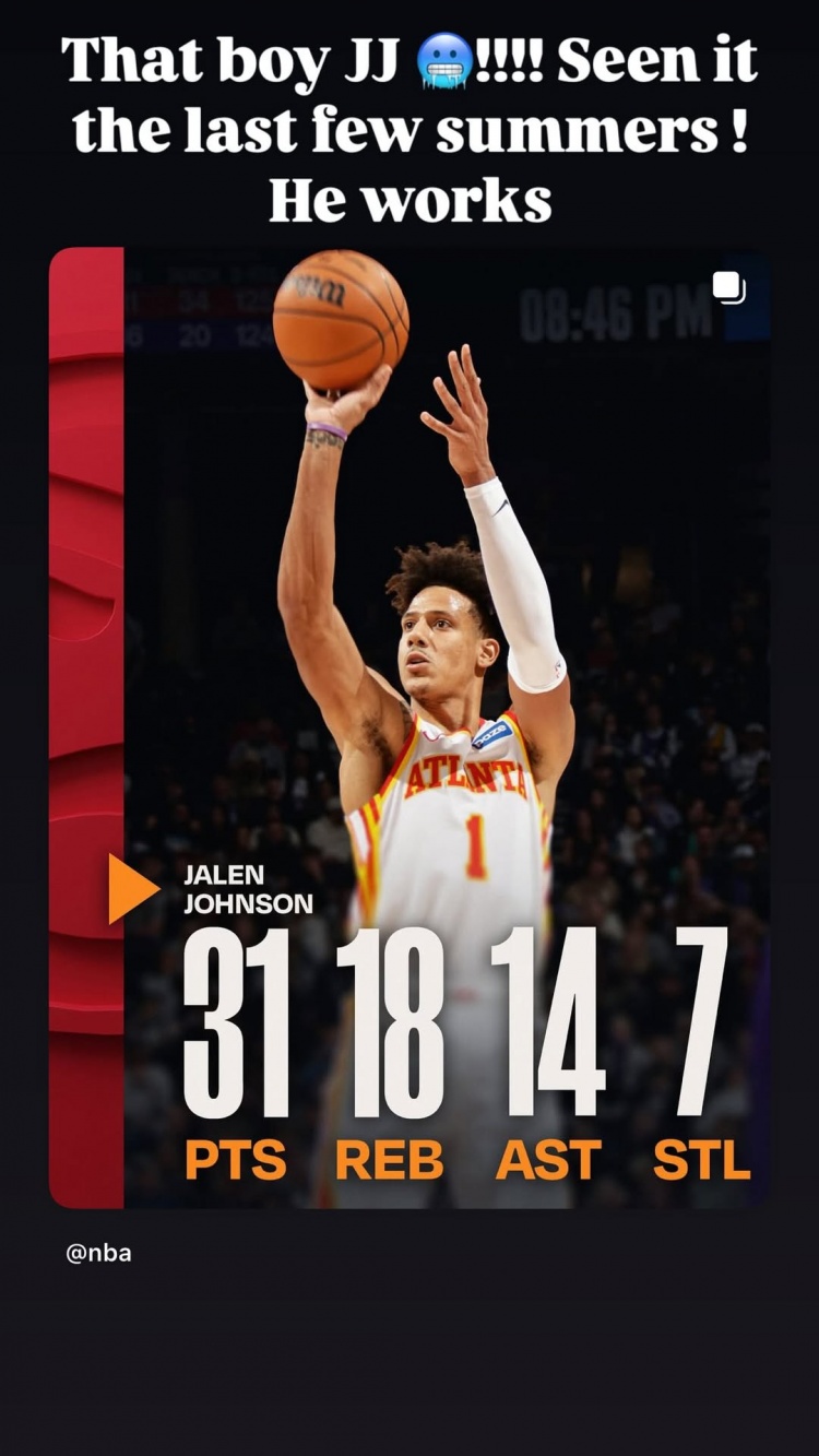詹姆斯转发了老鹰前锋杰伦·约翰逊在132-122客场击败爵士比赛中取得31分18篮板14助攻7抢断的数据图。