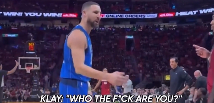 克莱受够了,直接问:“你TM谁啊?你不配跟我一桌,只有少数人配,上面那些人配!(克莱指的是热火球馆上空被退役球衣的名宿,见新闻首图)”