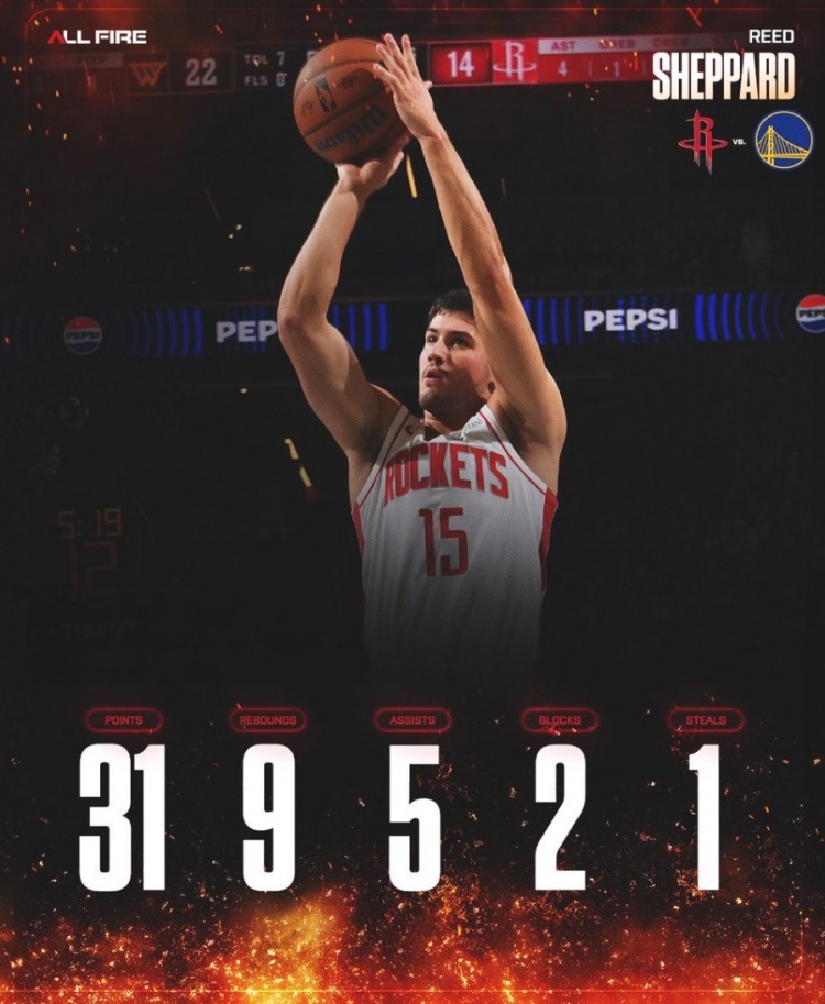 赛后,火箭官方为谢泼德制作专属数据海报,他的31分和9篮板都是生涯新高。